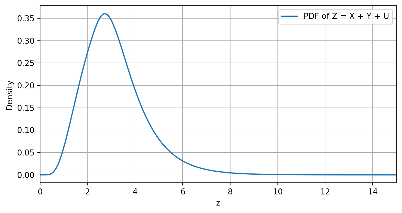 Following the setting of Insight 3.19 seen in class, let Z = X + Y + U with X \sim \text{LogNormal}(\mu,\sigma^2), Y \sim \text{Exp}(\lambda) and U \sim U(a,b), that is, Z is the sum of a log-normal, exponential and uniform distribution.